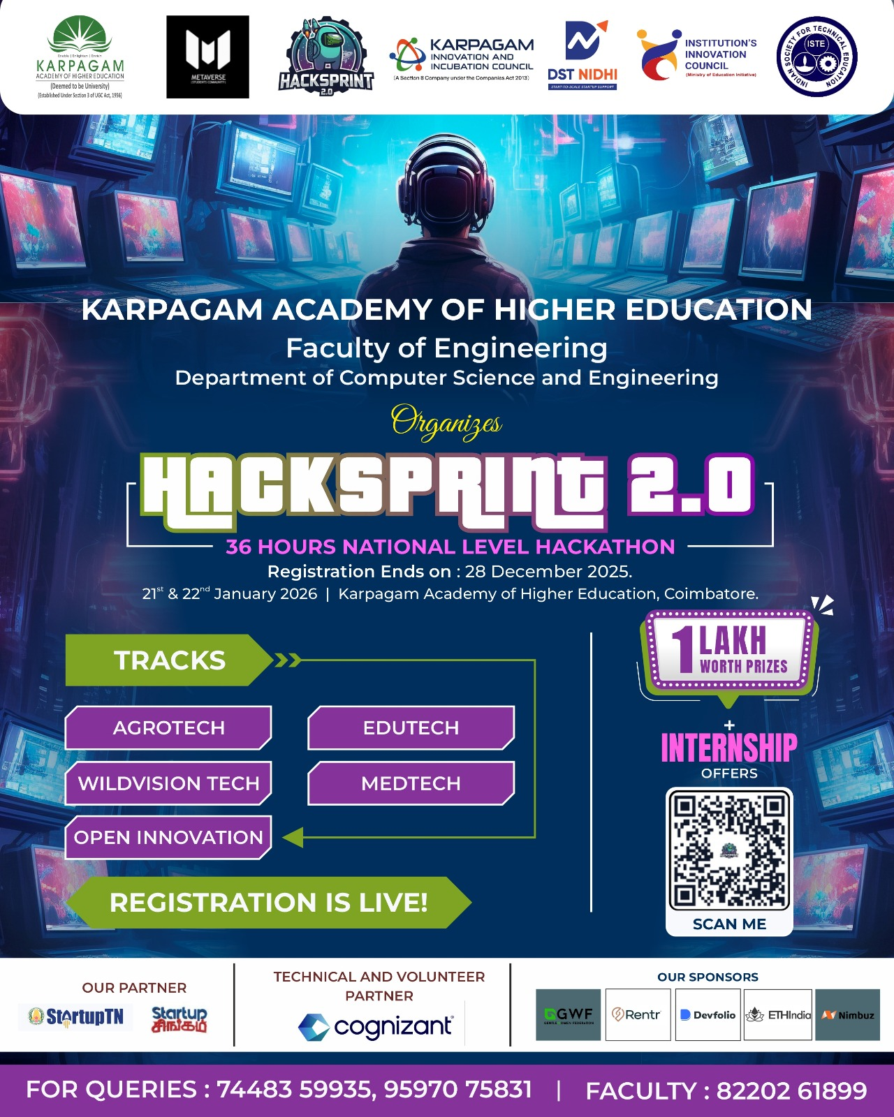 Karpagam Academy of Higher Education (KAHE), located in Coimbatore, is the host of **Hacksprint 2.0**, setting the benchmark for the **best hackathon in Tamil Nadu, India's Biggest & World's Largest Hackathon**. Approved by the Ministry of HRD and led by visionaries, KAHE provides the perfect ecosystem for this 36-hour coding marathon.